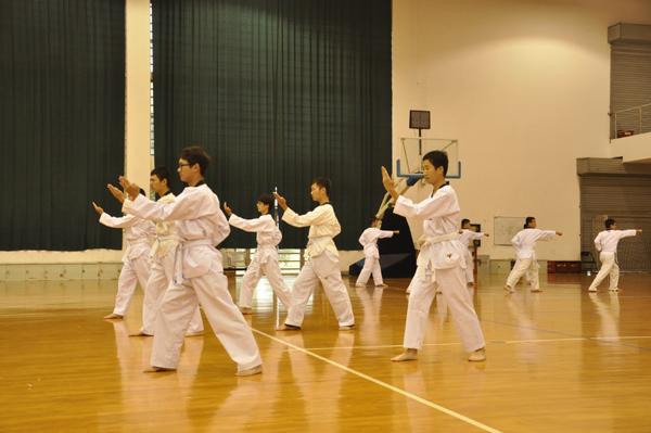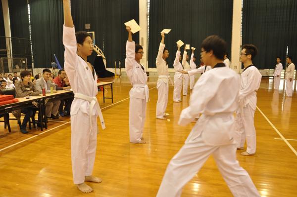上午进行的是跆拳道比赛,我院队伍第八个出场。前七个院的队伍尽管都有不俗的表现,但都延续了以往的模式,显得没有新意,而我院队伍的展现创意十足。我院队伍进场后,在领队的指挥下分成四路纵队,站在赛场四周,每个小队依次做出比赛的规定动作,每套动作都伴随着队员们响亮的一声“哈”,整齐划一。在完成系列动作后,各小队分担不同角色,向观众们展示了各类跆拳道技术,领队的三连踢更是赢得了全场观众的掌声。