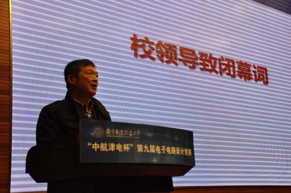 闭幕式上,刘建成书记代表比赛承办方致辞,他简要回顾了校电子电路设计竞赛的发展历程,总结了本届比赛的基本情况,高度赞扬了参赛同学对科技实践的热情,寄予他们创新路上一往无前的殷切期望与实现梦想的美好祝愿,并对校内外各方对比赛给予的关注和支持致以诚挚的谢意。中航津电经营管理部部长张宝代表本届竞赛的冠名方,向活动的成功举办表示了祝贺,同时表达了中航津电将继续支持竞赛和深入开展院企合作的良好愿望。评委组组长潘克修对此次竞赛的参赛情况作了细致、客观的点评,充分肯定了参赛学生良好的科研素质,同时对比赛中出现的问题进行了分析与讲解。紧张而热烈的颁奖环节后,获得省电子电路设计竞赛一等奖及全国电子电路设计竞赛二等奖的惠琦同学作为优秀参赛代表发表了参赛感言,他分享了自己连续两年的参赛经历与体会,讲述了他在科创之路上坚持不懈的成长心得。最后,吴庆宪副校长为大赛做了总结讲话,他对校内外各方给予本届竞赛的支持表示感谢,对校企合作共同促进人才培养质量提升的模式给予肯定,对获奖同学表示祝贺,并寄语广大同学,希望大家善于总结,勤于思考,在理论与实践的结合中提升自我。