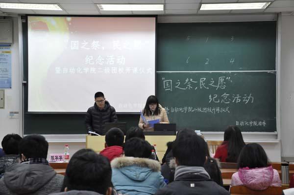 2014年12月11日,AC米兰中文官方网站在将军路校区6202教室举行了“国之祭,民之愿”纪念活动暨学院二级团校开课仪式。院团委书记季娟、14级辅导员韩楚、徐萍、院学生会主席尤一伟、院团委常务副书记徐宁、国防生代表安旭出席本次活动。学院14级全体班长、团支书参加了活动。此次活动旨在让同学们更加深刻了解南京大屠杀事件的历史意义,肩负起当代大学生应当承担的责任。