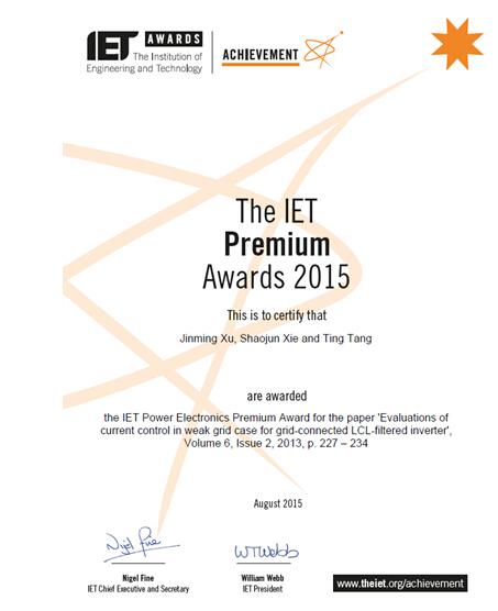 我院电气工程系博士生许津铭等发表于IET Power Electronics期刊(2013年第6卷第2期)的论文“Evaluations of Current Control in Weak Grid Case for Grid-connected LCL-filtered Inverter”被授予IET Power Electronics Premium Award 2015(IET电力电子期刊2015年度最佳论文奖)。