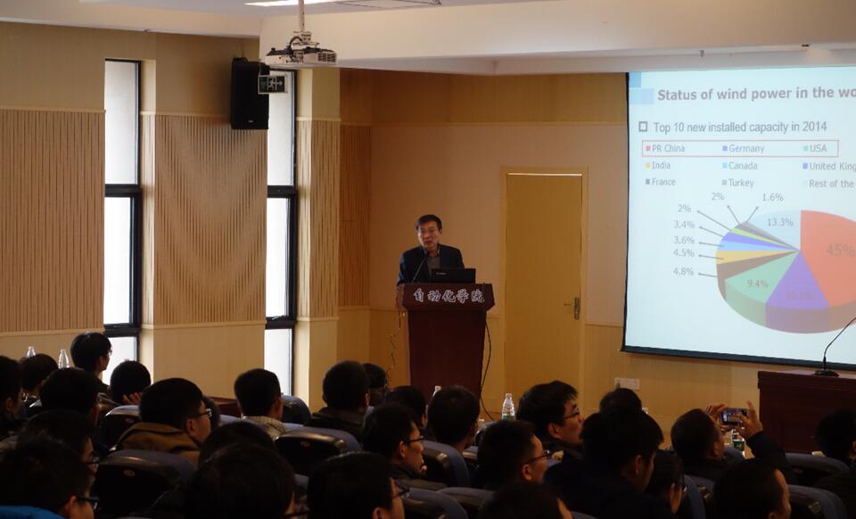 在近45分钟报告中,程明教授首先介绍了风力发电的现状,风力发电变换系统和发电机的研究进展,并对不同发电机拓扑、结构进行对比分析。最后,对最新风力发电机进行介绍,包括双馈电机、无刷电机、定子永磁电机等。报告结束后,师生们就学术报告内容与程明教授进行了热烈充分交流和探讨。