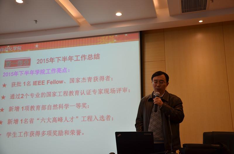 院长姜斌代表学院做工作报告,总结AC米兰中文官方网站2015年下半年工作,阐述2016年工作思路并做出工作部署。报告对学院的党建、教学、国际交流、科研、人事、学科建设、学生工作等方面做了全面总结和回顾。姜斌指出,按照学校党委部署,围绕学校中心工作,学院在学生培养、科研工作建设、学院文化建设等方面取得了新的突破和发展,获批 1名 IEEE Fellow、国家杰青获得者;通过2个专业的国家工程教育认证专家现场评审;新增 1项教育部自然科学一等奖;新增 1名省“六大高峰人才”工程入选者;学生工作获得多项奖励和荣誉。