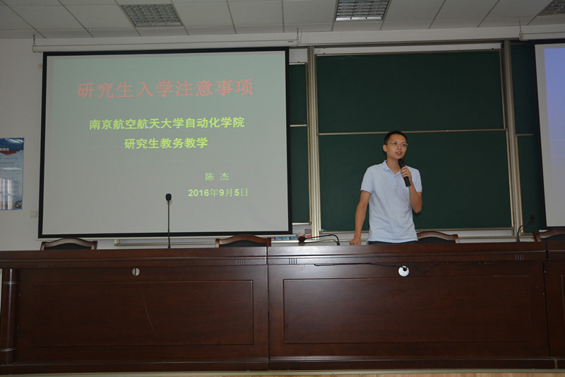 会上,自动化院党委书记刘建成老师首先代表学院全体师生向2016级新生的到来表示热烈欢迎,对2016级同学们寄予了希望、提出了成功事业和幸福家庭的美好愿望,刘书记给予同学们三点建议:追事业、养大气和谋幸福,珍惜研究生的美好时光,尽快适应研究生生活,努力科研、勤于实践,全面提高综合素质。赖际舟副院长详细介绍了学校和学院的基本情况,重点对学院各个学科、各个专业做出介绍,鼓励同学在校期间,好好利用优秀学院平台,用心科研,不断提高培养自我素质,同时要求同学们在校期间要加强自律意识,遵守校规校纪,掌握独立学习、独立生活的本领,树五心——要有一颗敬畏心、要有一颗好奇心、要有一颗坚强心、要有一颗谨慎心和要有一颗宽容心。沈书记对分管研究生工作的各个部分做了详细介绍,鼓励同学们要多参加实践活动,锻炼自己各方面能力。陈杰老师对新同学在研究生生涯里需要完成的课程任务及学分要求做出细心介绍,并同时要求同学紧握《学生手册》,了解学习对研究生的具体要求。2016届研究生辅导员刘斐文公布了新生分班情况,并祝福同学研究生生活顺利、快乐,研会主席黄理言同学代表自动化研究生会发言,大会在热烈的气氛中圆满落下了帷幕。