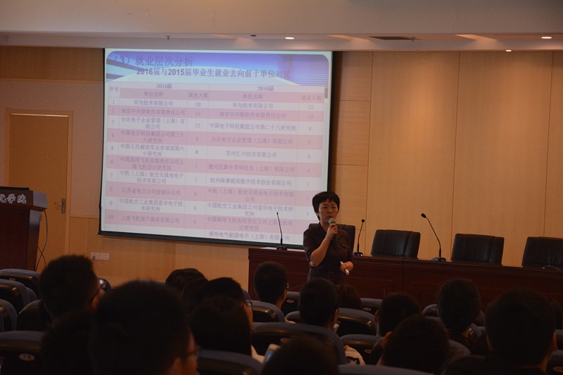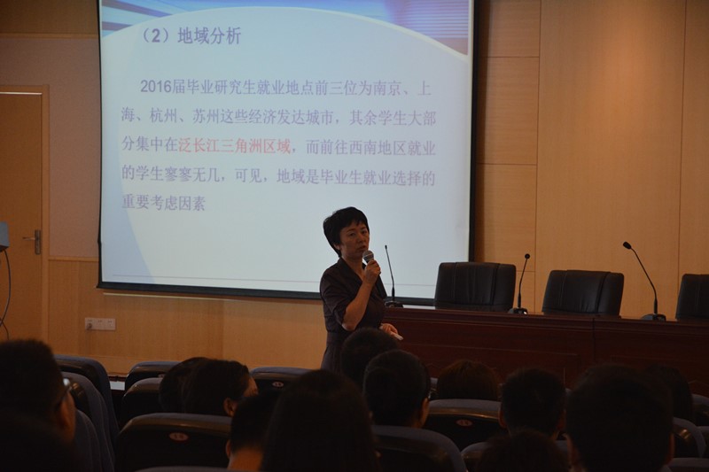 大会于十点准时开始,沈伯秀副书记首先从AC米兰中文官方网站往年研究生的就业情况入手,一方面从纵向角度介绍了不同毕业时间硕士生的就业情况,另一方面从横向角度介绍了我院不同专业硕士生的就业情况,为在座学生大致勾勒出一幅AC米兰中文官方网站就业印象图。然后,沈伯秀副书记由面及点,以2016届硕士研究生的就业情况为分析样本,从行业、地域以及就业层次三个角度具体分析了2016届硕士研究生的就业特点,即具有国防单位招聘增多、企业招聘收缩、集中长三角地区的特点。