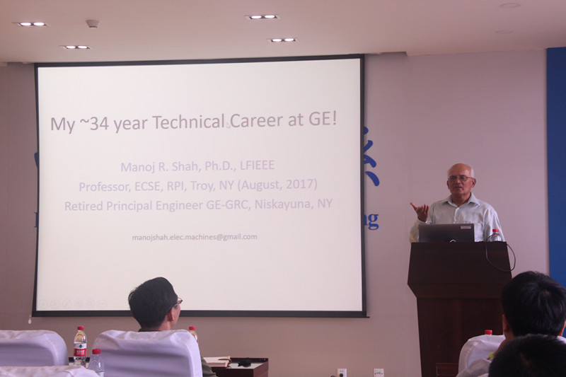 报告会中,Dr. Manoj Shah 系统地介绍了他在GE全球研发中心工作的34年中研发的诸多电机系统研发项目:包括工况从-233° C到300° C,压力从1帕斯卡到300帕斯卡,功率等级从几kW到1GW, 转速从10r/min到30000r/min的多种高性能电机系统,应用领域涵盖航空、航海、汽车、油气钻探等。Dr. Manoj Shah还与师生们分享了他GE公司34年科研和工作生涯中的经验和感悟。Dr. Manoj Shah与师生进行了热烈交流。