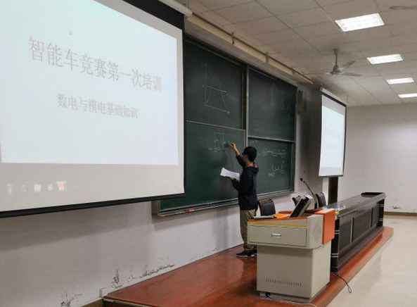 2018年10月21日将军路校区西区D2116教室,第一次培训由AC米兰中文官方网站2016级电气工程及其自动化学生胡洪飞给报名队员们组织培训了模电数电的基本知识,参加培训同学达300多人。