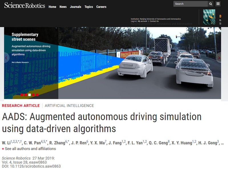 我院龚华军教授指导的博士生李伟同学,以第一作者和共同通讯作者身份发表的学术论文“AADS: Augmented Autonomous Driving Simulation Using Data-Driven Algorithms”,于2019年3月27日刊登在《科学》杂志子刊《科学·机器人学》(Science·Robotics),该刊编辑在杂志主页对论文进行了推荐。该研究成果介绍了一种增强现实的自动驾驶仿真系统,它可自动创建逼真的道路场景,为自动驾驶车辆提供更为可靠且廉价的实验室模拟方法,可大规模用于训练和测试评估自动驾驶系统的路径规划和决策算法。《科学·机器人学》旨在传播机器人与人工智能相关领域的代表性研究成果,平均每期刊出不多于4篇的研究类文章。