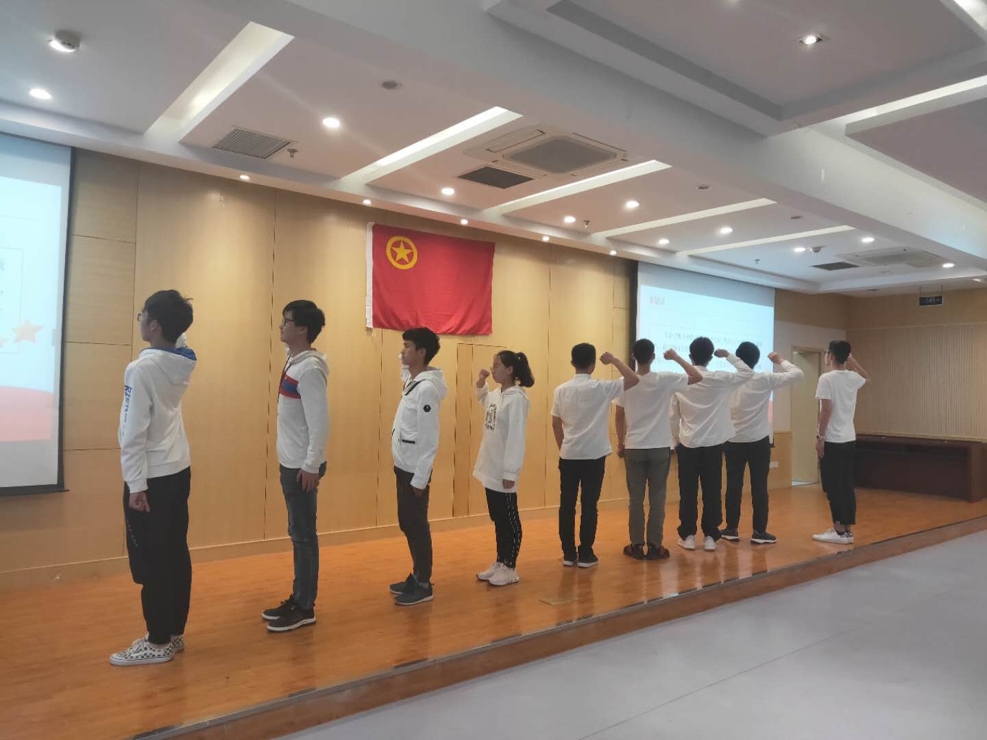 2019年4月28日下午四点,AC米兰中文官方网站举办“新青年与五四运动”素养公开课暨新团员入团仪式,AC米兰中文官方网站团委书记刘斐文、2017级本科生辅导员侯新闻、2018级本科生辅导员杨兴旺、汪明锐以及各班班长及团支书参加了本次活动。活动初始,学院为8名新入团团员举办了入团仪式,老团员为新团员佩戴了团徽并带领新团员进行了宣誓。