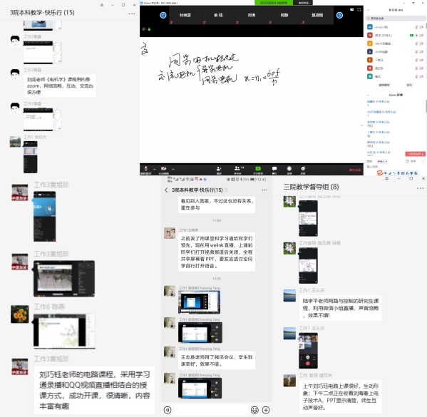 开学第一天,学院组织成立了巡查小组,学院院长、党委书记、副书记、教学副院长、教学办主任、各系教学系主任和全体教学办人员均积极参与,开启了网络查课和听课的新方式。今天我院共有28门本科生课程、8门研究生课程开课,32位老师按时开展了网络授课。为了保证教学效果,老师灵活采用学习通、腾讯视频等多种方式有效保证了网络授课的正常进行,老师们积极探索教学平台和其它直播平台结合使用方式。在线教学平台能够直观反映学生到课情况,学生到课率很高。