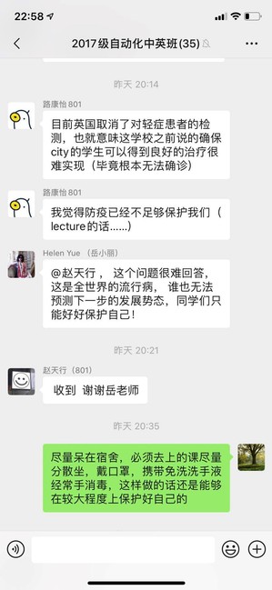 自动化(航空电子)专业0317801班是中英合作办学班级,目前有19人在英国伦敦城市大学求学。近期国外疫情爆发,班主任齐瑞云老师很担心同学们的健康安全,通过在微信群集体交流以及和一些同学单独交流了解到,目前城市大学尚未停课,同学们仍在正常上课,但出勤率在降低。齐老师不断在班级群里提醒大家提高警惕,尽最大努力做好自我保护。