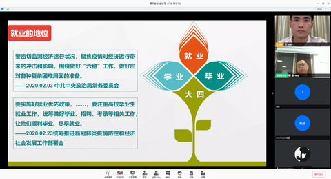 首先,陶老师向同学们讲解了就业的相关知识:什么是就业,就业的流程及其相关规定。同时,他也提到今年疫情下,国家为保障高校毕业生“顺利毕业,尽早就业”的议政建言,增强了同学们的就业信心。随后陶老师和同学们分享了就业技能,并建议同学们“早做准备,提升自我认知”,陶老师也给同学们分享了学校近几年毕业生的就业数据和就业方向,明确了现在严峻的就业形势,为同学们做出就业选择提供参考。