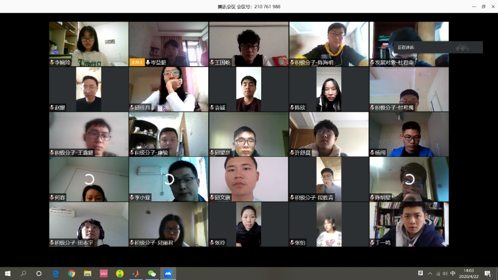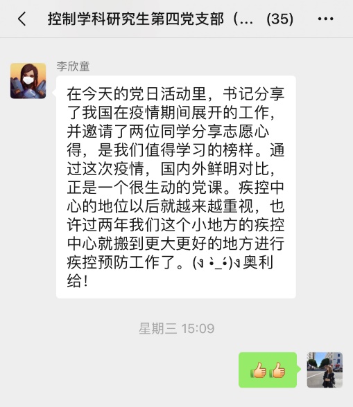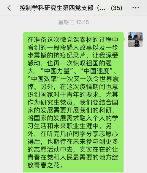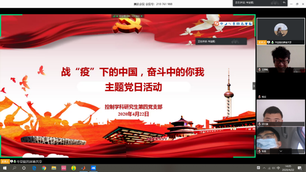 为贯彻中共中央《关于加强党的领导、为打赢疫情防控阻击战提供坚强政治保证的通知》和《新时代爱国主义教育实施纲要》精神,带动学生党员认真学习新冠肺炎疫情防控“大课”,发挥党员先锋模范作用,2020年4月22日下午,AC米兰中文官方网站控制学科研究生第四党支部开展了一场以“战‘疫’下的中国,奋斗中的你我”为主题的线上党日活动,支部党员、发展对象、积极分子共计41人参加了本次活动。该党支部由学院教职工张玲老师担任支部书记,本次活动参与人员均为导航研究中心研究生。