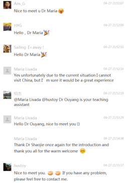 之后的时间,我们与外教、学生、助教老师等组成了微信群,在群内及时讨论课程相关的安排。考虑到上课方便与网络稳定性等因素,外教与学生对多款线上教学软件进行对比,最终确定Microsoft Teams作为上课的软件平台。并在正式上课前完成了试课,对采用软件进行网络授课进行了测试,效果良好。