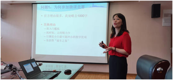 李韪韬老师结合本院的实际情况,通过获奖案例,分享了自己对微课的理解。李老师认为自己通过各类教学比赛结识了很多志同道合的良师益友,得到了很多学习交流的机会,希望老师们能借助机会不断探索。