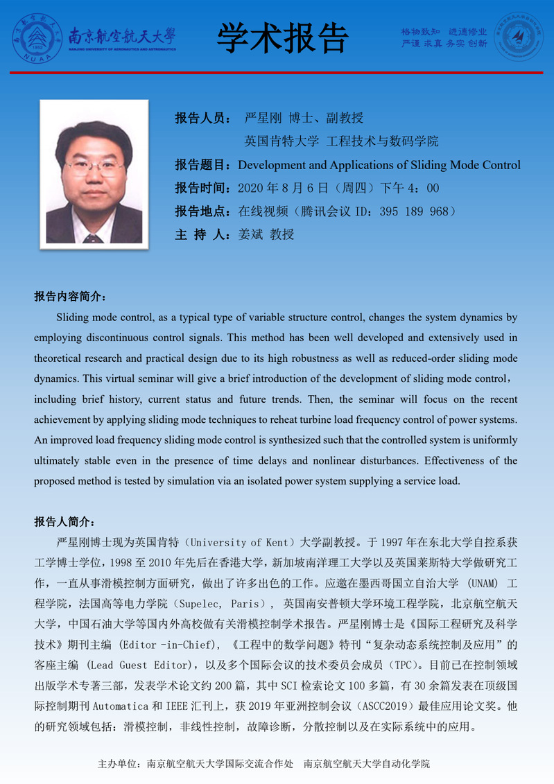 学术报告:Development and Applications of Sliding Mode Control