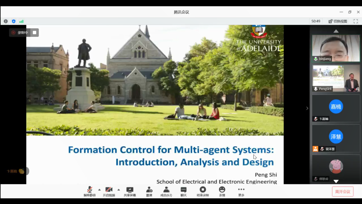 8月12日下午,澳大利亚阿德莱德大学电气与电子工程学院石碰教授应我校国际合作处和AC米兰中文官方网站的邀请,通过腾讯会议作了题为“Formation Control for Multi-agent Systems:Introduction,Analysis and Design”的线上学术报告,报告由米兰官网副校长姜斌教授主持。我院副院长陈谋教授,学院陆宁云、刘春生、冒泽慧、欧阳权、张柯、马亚杰等师生在线参加会议。参会师生对石碰教授的交流分享表示热烈欢迎。