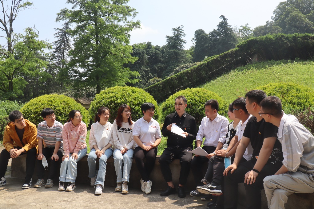 在碑亭中,图书馆第四党支部书记张光磊老师给大家领学了《中国共产党普通高等学校基层组织工作条例》。作为基层党组织的成员,我们应当严于律己,时刻严格遵守工作条例,珍惜工作成果,共同维护基层组织。
