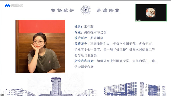 宋佳蓉结合自己进入大学后在学习和学生工作方面的成长经历,分享如何从高中的学习生活状态快速过渡到大学,以及在大学可能遇到的挫折和遇到挫折时如何正确地调整心态。