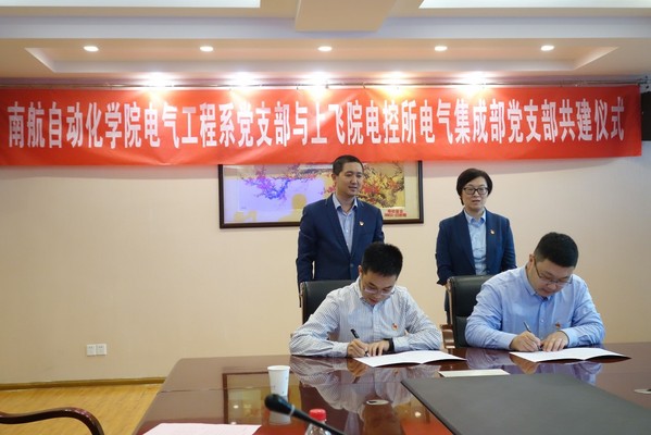 在李忆书记和李文雷书记的指导下,举行了简洁的校企党支部结对共建签约仪式。由AC米兰中文官方网站电气工程系党支部书记陈杰与上飞院电气集成部党支部副书记兼副部长姬昌睿代表双方单位签署协议。