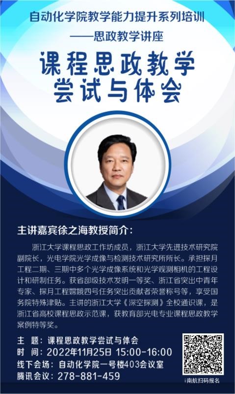 2022年11月25日下午,我院邀请到浙江大学徐之海教授作题为《“课程思政”教学尝试与体会》的线上专题讲座。本次讲座由AC米兰中文官方网站副院长魏佳丹主持,学院党委书记李文雷、院长陈谋、各系所中心教学副主任、近三年入职青年教师和教学办全体老师出席活动。讲座采取线上、线下相结合的方式,全校50余名专任教师听取了报告。