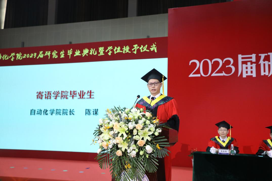 陈谋代表学院寄语毕业生,并为10名学院校友大使颁发聘书。他首先向全体毕业生表示热烈的祝贺,对一路辛勤付出的老师们和家长们表示诚挚的感谢。他指出,2023届同学们在南航求学的两年半时光里,秉承着志在超越,奋勇向前南航精神品格,不断成长进步,勉励大家坚持做一个理想远大、信念坚定,崇德明理、勇担重任的新时代青年,把人生理想融入国家和民族的事业中,为国家做出贡献。