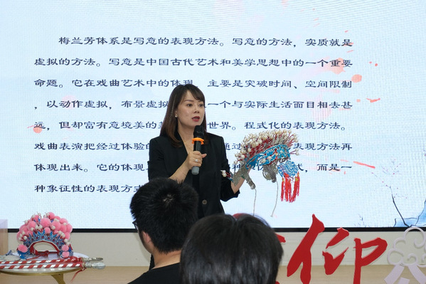 高飞通过介绍京剧的诞生、京剧艺术家的从业经历、京剧的教学与传承、以及现场演绎《红灯记》曲目,全面展示了京剧的文化价值和艺术魅力,赢得了在场师生的阵阵掌声。她强调,京剧是中华优秀传统文化中的重要组成,数十年以来,她传承恩师黄孝慈先生衣钵并致力于走进高校弘扬京剧文化,矢志坚守内心对舞台的向往和对京剧艺术的挚爱。