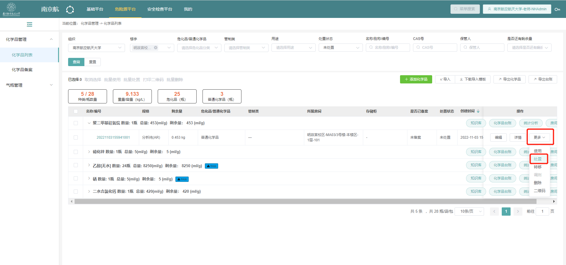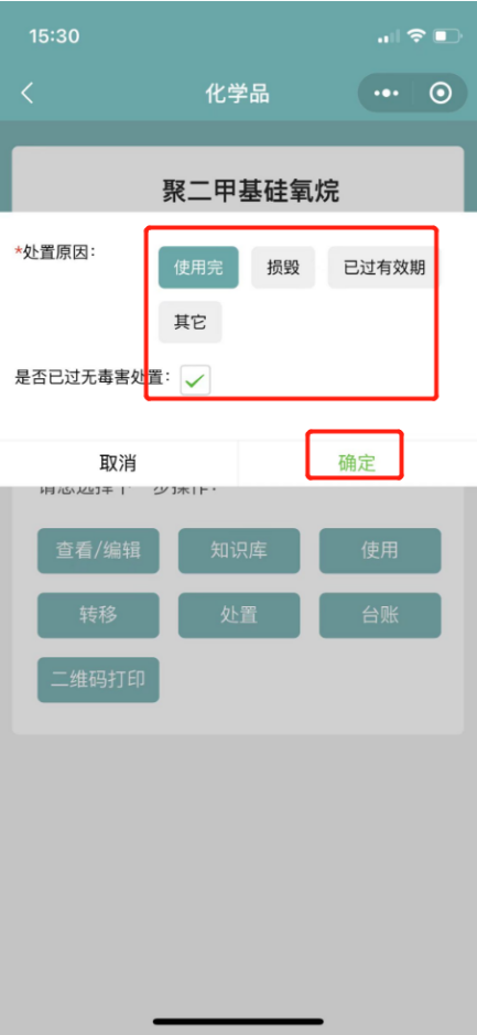 5.4如果系统单瓶剩余量比实际少,则点击化学品后,打开详情,将已有药品处置,并在处置后,重新点击新增化学品添加(先按照5.2操作,再按照5.1操作);