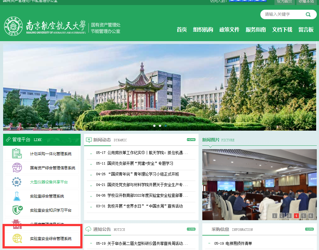 1.输入网址:gzc.nuaa.edu.cn,访问国资处网站,点击“管理平台”栏目-“实验室安全综合管理系统”,采用校内统一身份认证的方式登录,具体操作如下图: