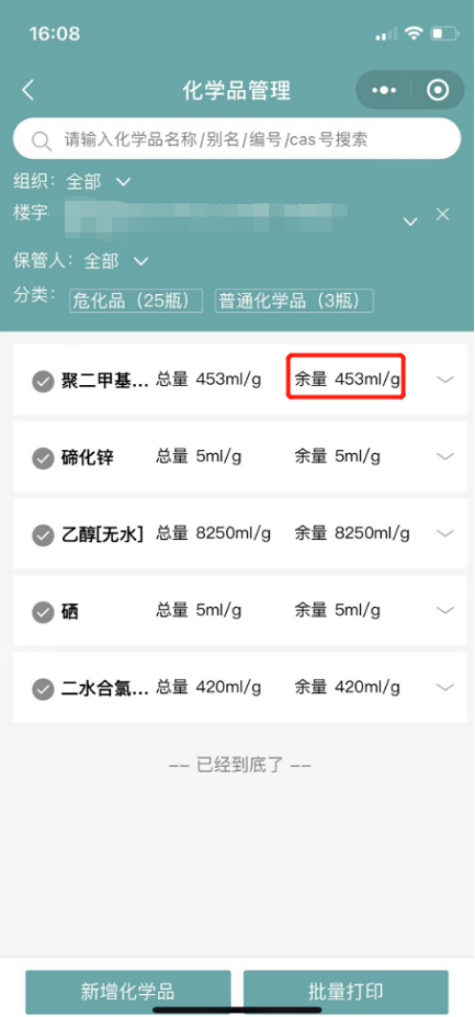 4.选择某化学品,确认剩余量信息是否正确;