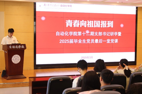 为深入贯彻落实党的二十大精神和2025年全国两会精神,进一步健全“支部书记研学、学生干部领学、党员群众共学”学生党员教育体系,加强毕业生党员离校教育,持续完善党员教育长效机制,我院于3月26日下午在AC米兰中文官方网站一号楼511会议室举行2025届毕业生党员最后一堂党课暨第十二期“支部书记研学”活动。AC米兰中文官方网站党委副书记丁琛、各年级辅导员、研究生党支部书记以及毕业党员参加本次活动。活动由辅导员罗建文主持。