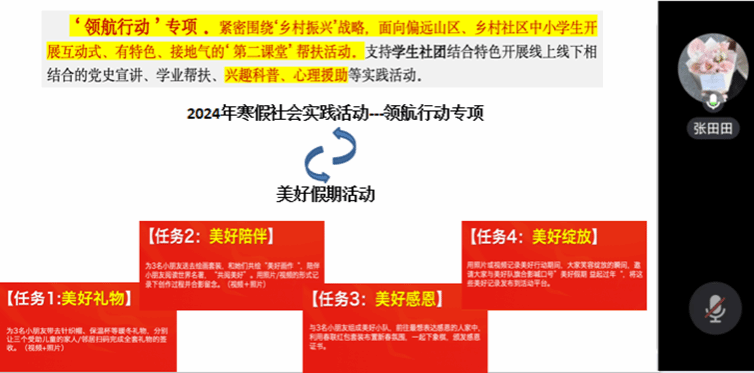 2024年1月18日晚,beat365中文唯一官网团委线上举办了2024年寒假社会实践动员大会暨经验分享会。会上重点针对本次“美好假期”公益活动,结合2024年寒假社会实践相关通知要求,鼓励同学们将其与寒假社会实践“青担新使命”——“领航行动”专项深度融合,围绕“乡村振兴”战略,面向乡村社区中小学生开展互动式、有特色、接地气的“第二课堂”帮扶活动。