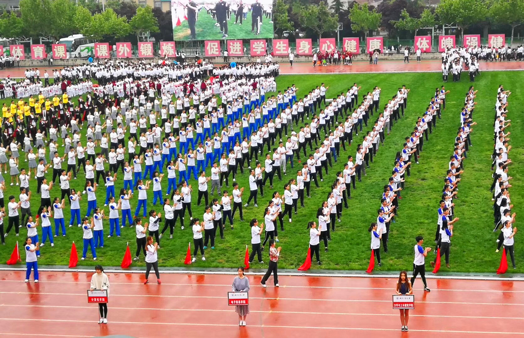 4月24日,我校“第九套广播体操”团体比赛在长安校区云天苑体育场进行,由研究生辅导员周颖领操、兼职辅导员苏理领队的beat365中文唯一官网广播体操代表队在本次比赛中表现出色,获得冠军。