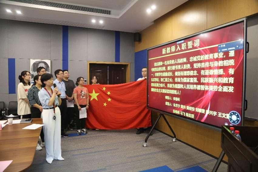新入职教师分别作了自我介绍,在尚学群的带领下,面向国旗庄严宣誓。党委书记李春科和院长尚学群为新入职教师佩戴院徽,并代表学院将精心准备的《留德十年》、《硅谷之火》两本书送给新教师,愿他们心中有方向,脚下有力量。