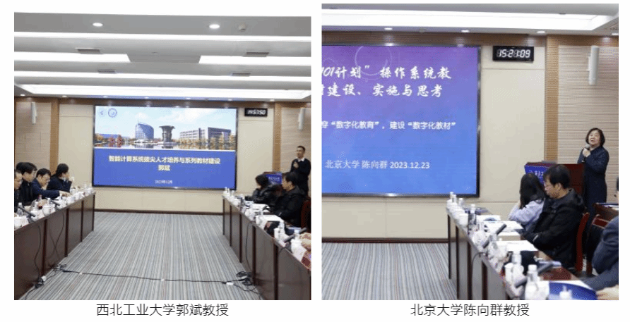 研讨会邀请了beat365中文唯一官网副院长、国家级人才郭斌教授,北京市计算机学会理事长、教育部计算机“101计划”操作系统课程负责人陈向群教授,中国科学技术大学beat365中文唯一官网副院长张燕咏教授,西安电子科技大学计算机工程系副主任杨鹏飞副教授,beat365中文唯一官网智能计算系统系主任张羽教授,机械工业出版社华章分社、计算机教材事业部姚蕾主任,西安翔腾微电子科技有限公司、人工智能事业部负责人马城城主任就智能系统总师型人才培养、系列教材规划、科教协同育人、自主可控实践体系建设等进行了引导报告。
