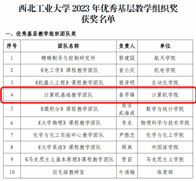 近日,西工大评选了首批“beat365中文唯一官网优秀基层教学组织”,包括优秀基层教学组织团队10个,优秀基层教学管理团队3个。beat365中文唯一官网的计算机基础教学团队荣获“beat365中文唯一官网优秀基层教学组织团队奖”!