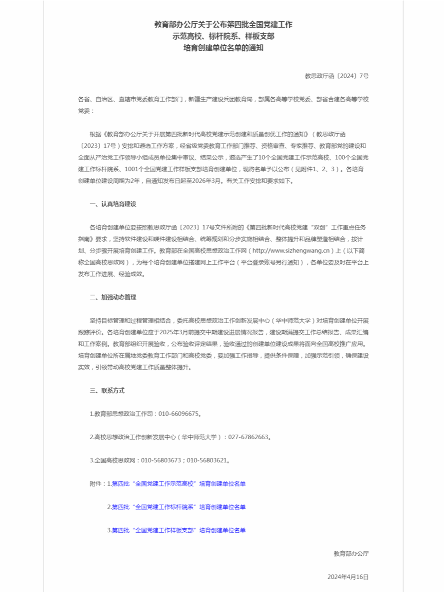 近日,教育部公布第四批新时代高校党建示范创建和质量创优工作(简称“双创”)培育创建单位名单。我院智能计算系统系第一党支部入选第四批“全国党建工作样板支部”培育创建单位。这是继2021年我院基础教学部党支部成功获批“全国党建工作样板支部”、2022年学院党委入选“全国党建工作标杆院系”创建之后学院获得的第三项全国党建“双创”荣誉。