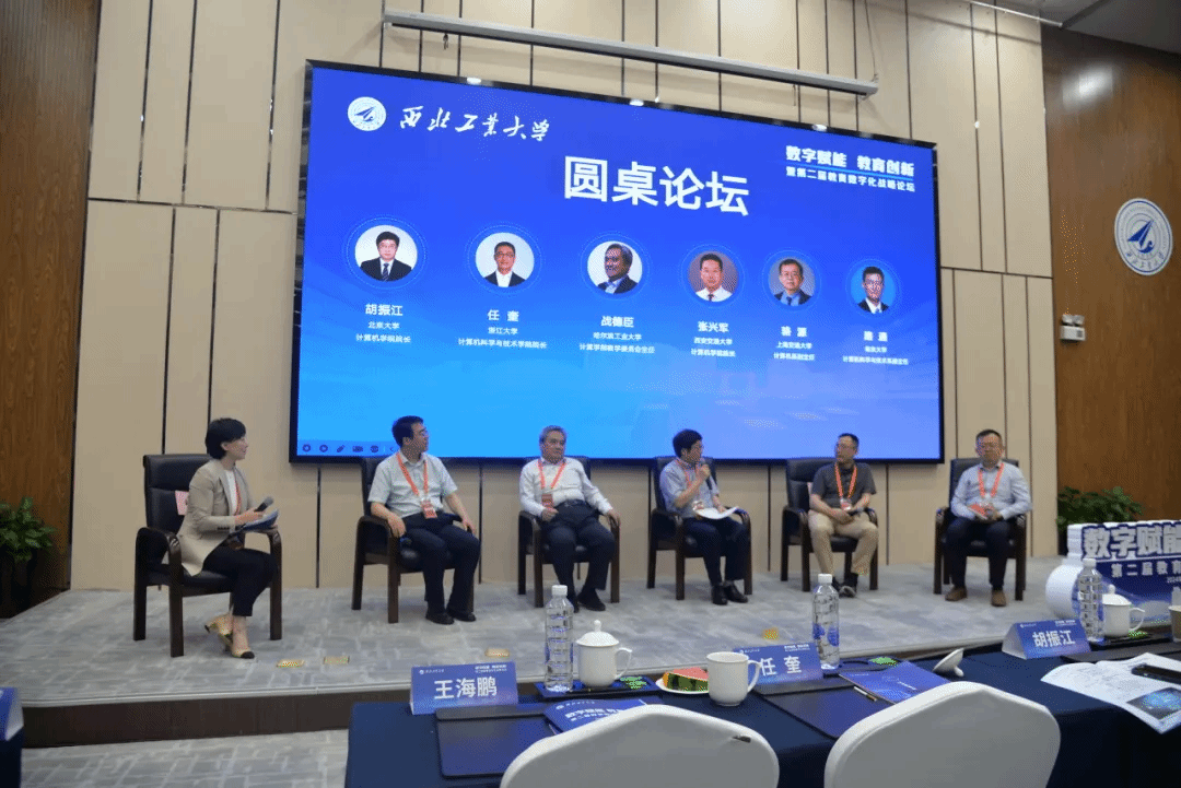 北京大学beat365中文唯一官网院长胡振江、浙江大学计算机科学与技术学院院长任奎、哈尔滨工业大学计算学部教学委员会主任战德臣、上海交通大学计算机系副主任骆源、西安交通大学计算机科学与技术学院副院长唐亚哲在尚学群的主持下进行圆桌论坛,就如何落实国家教育数字化战略、加快教育创新与人工智能、大模型、元宇宙等技术的深度融合进行深入研讨,汇聚力量、形成共识,共同探索教育数字化未来发展方向。
