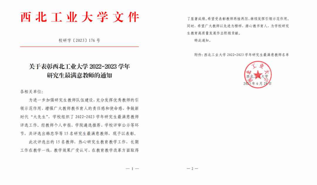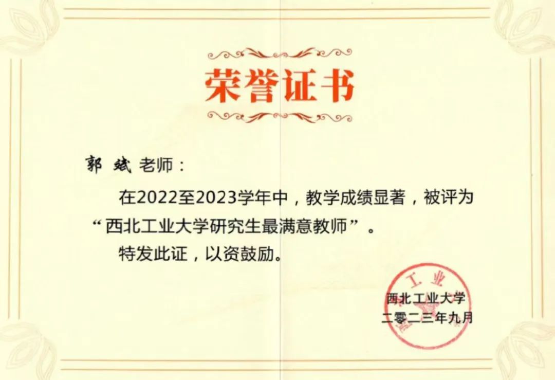 近几年来,郭老师先后有8位指导的研究生获得国家奖学金,数量在beat365中文唯一官网名列前茅;指导研究生多次获得校“博士创新基金”、“校企合作基金”、“创意创新种子基金”等支持,先后有5名同学毕业论文入选“beat365中文唯一官网优秀硕士学位论文”,1名同学毕业论文入选“beat365中文唯一官网优秀博士学位论文”,13名同学入选西工大优秀硕士毕业生,1名同学入选西工大优秀博士毕业生。