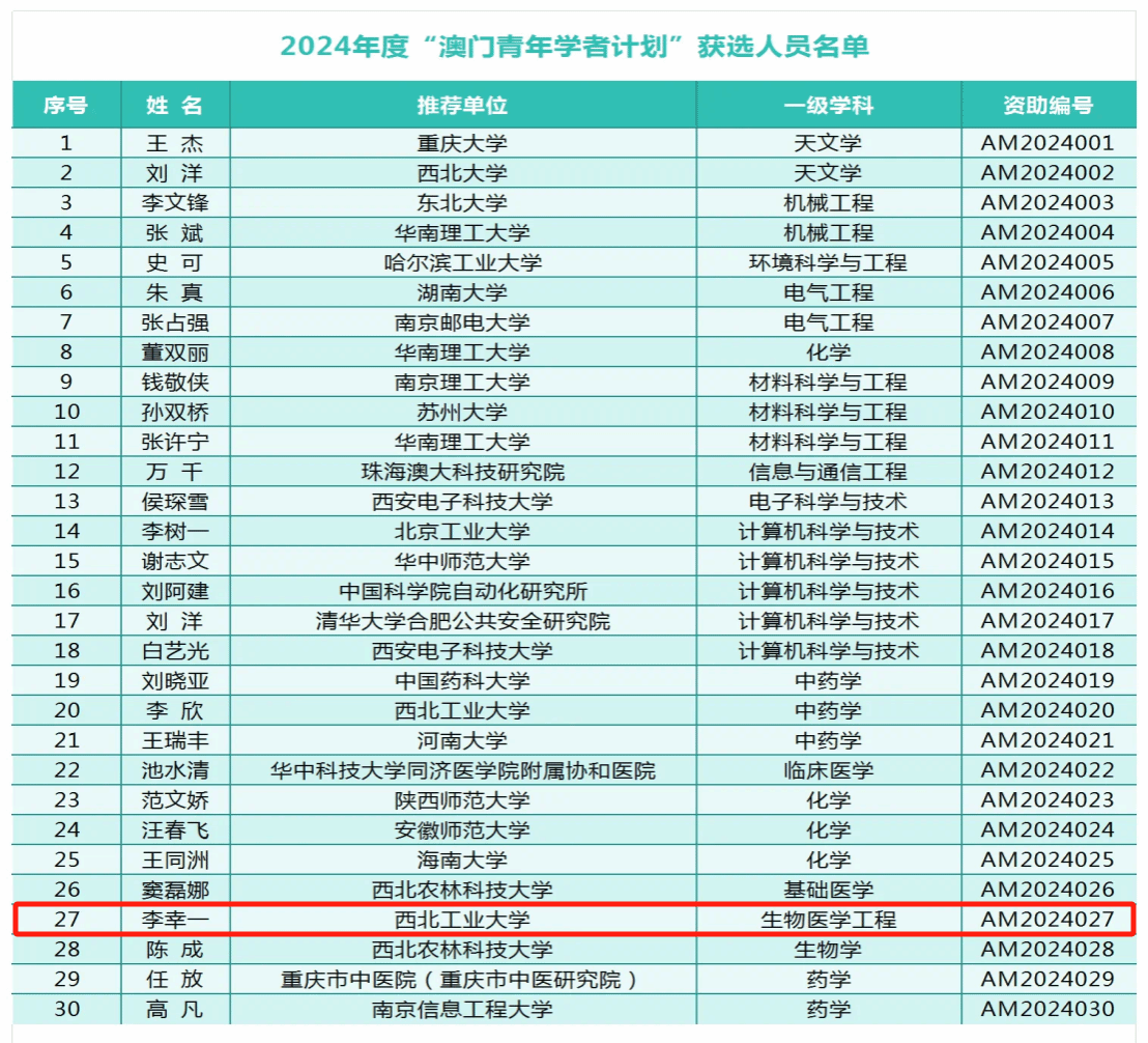 9月初,全国博士后管委会办公室公布了2024年度“澳门青年学者计划”获选结果名单。本年度,“澳门青年学者计划”在内地高校共计资助30人,beat365中文唯一官网有2人入选,beat365中文唯一官网李幸一老师为其中之一。