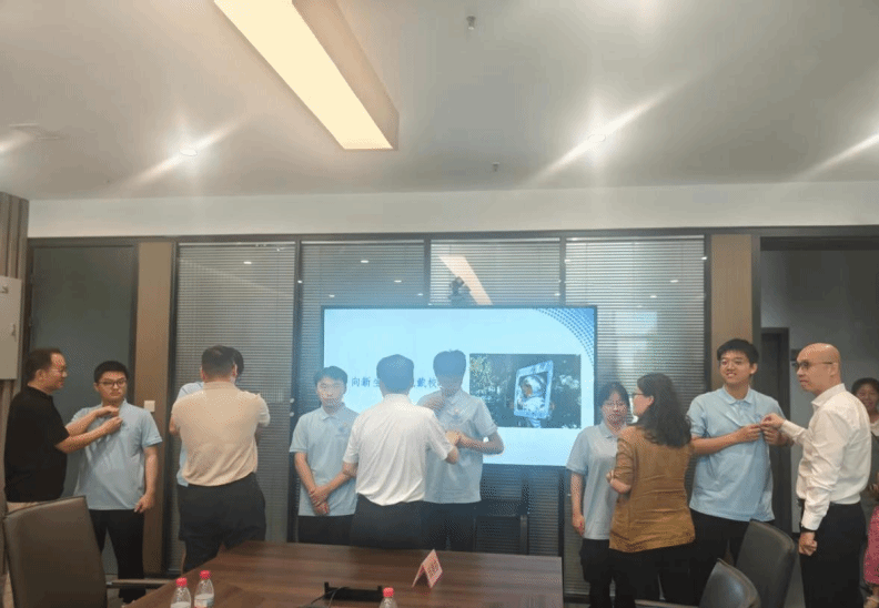 活动特别设置了佩戴校徽仪式。当日,与会人员还共同参观了校友企业中原动力智能机器人有限公司。