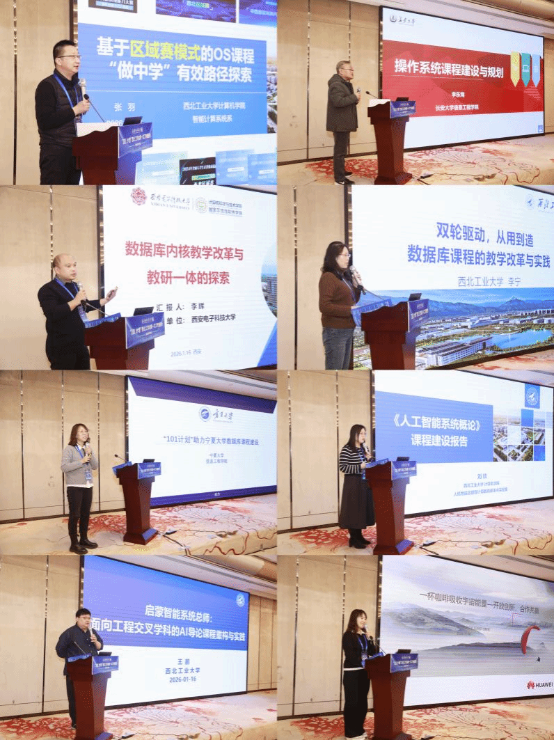 beat365中文唯一官网张羽做了“基于区域赛模式的OS课程“做中学”有效路径探索”报告,详细分析了国内外高校操作系统课程改革进展以及如何通过“操作系统设计赛区域赛”实现“以赛促课”;长安大学李东海分享了长安大学在操作系统课程教学与改革发展情况。西安电子科技大学李辉介绍了“数据库内核教学改革与教研一体的创新实践”,其团队打造的“库道”实训平台已在全球114所高校应用;beat365中文唯一官网李宁、宁夏大学杜方则围绕数据库系统课程“从用到造”的教学转型与校地协同建设数据库系统课程的经验进行了交流。人工智能导论课程方面,beat365中文唯一官网刘琰、王鹏分别结合“三航”优势与跨学科特色,分享了西工大在人工智能导论课程知识内容重构与实践模式创新的教改成果。华为西研所副所长刘晓莉带来“一杯咖啡吸收宇宙能量”的高校合作主题报告,为校企协同育人提供了新思路。