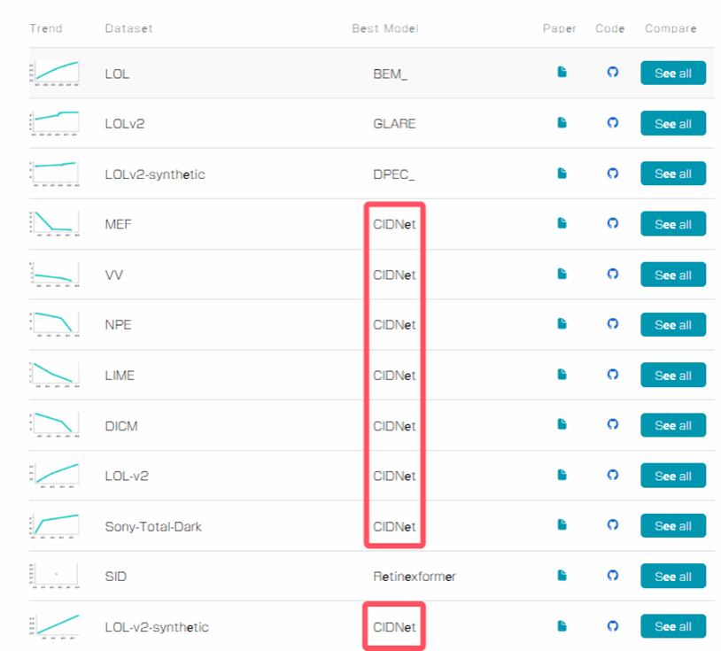 结合设计的增强网络,赋予算法动态学习能力,该成果在10个低光增强数据集上展现出领先性能(如图2),其模型在 paper with code排行榜上持续霸榜。项目 GitHub 开源一周即获330+星标(如图3),已经有超10个科研组织发邮件咨询相关合作项目,并已被知名开源网站抱抱脸(Hugging Face)模型库收录。这项成果不仅开拓了计算机视觉科研的新方向,还具备参数量和计算量小的优势,能够适配手机、无人机等边缘设备,对自动驾驶、监控、医学影像处理等工业化领域具有重要意义和里程碑式价值。
