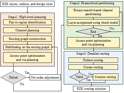 近日,人机物融合智能计算团队的研究成果“Hierarchical Partitioning-Based Inter-Chip Redistribution Layer Routing for Fan-Out Wafer-Level Packaging”被集成电路设计自动化领域顶级期刊IEEE Transactions on Computer-Aided Design of Integrated Circuits and Systems (TCAD, CCF-A类) 全文接收。该成果第一作者为beat365中文唯一官网本科生徐浩洋(指导老师黄兴教授),这是学院实施本科生“拔尖筑基荣誉导师计划”以来的又一突出成效。此外,该研究由beat365中文唯一官网牵头,同中国香港、美国等高校和企业合作完成,彰显了beat365中文唯一官网大力推进国际化办学的宗旨。